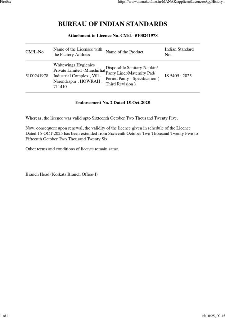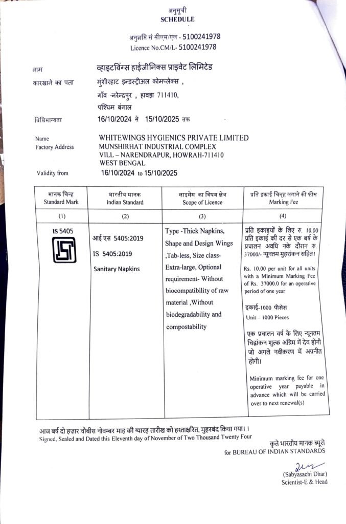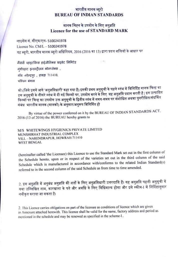 NF PREMIUM, NF REGULAR sanitary pad manufactured by company Whitewings Hygienics Pvt. Ltd. (Munshirhat Industrial Complex, Vill- Narendrapur, Howrah-711410, West Bengal) bearing BIS Licence No. CM/L -5100241978 (IS 5405 For SANITARY PAD) from BUREAU OF INDIAN STANDARDS.